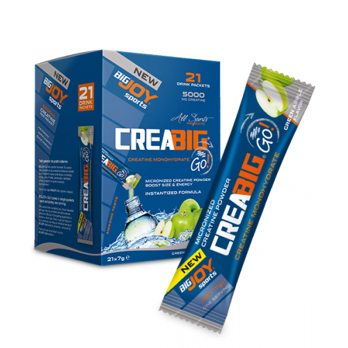 Bigjoy Creabig Go! 300gr’lık aromasız olan diğer versiyonuna göre bu kez yeşil elma aromalı olarak hazırlandı. Toz formda olan ürün tek kullanımlık paket içerisinde 5000 mg mikronize kreatin içeriyor.